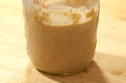 The liquid in the jar was fed whole wheat flour to turn it to paste and within four hours the mass sprang to life doubled in size with visible air pockets on the side of the jar and with a sweet odor. Shockingly fast. At room temperature.