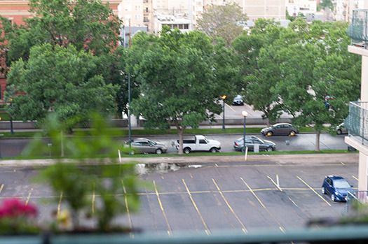 The wind kicks up it rains. The sky brightens the rain stops. Still bright the rain begins again and develops even harder then abruptly stops. The plants on the terrace never get wet, although the ones hanging get damp.