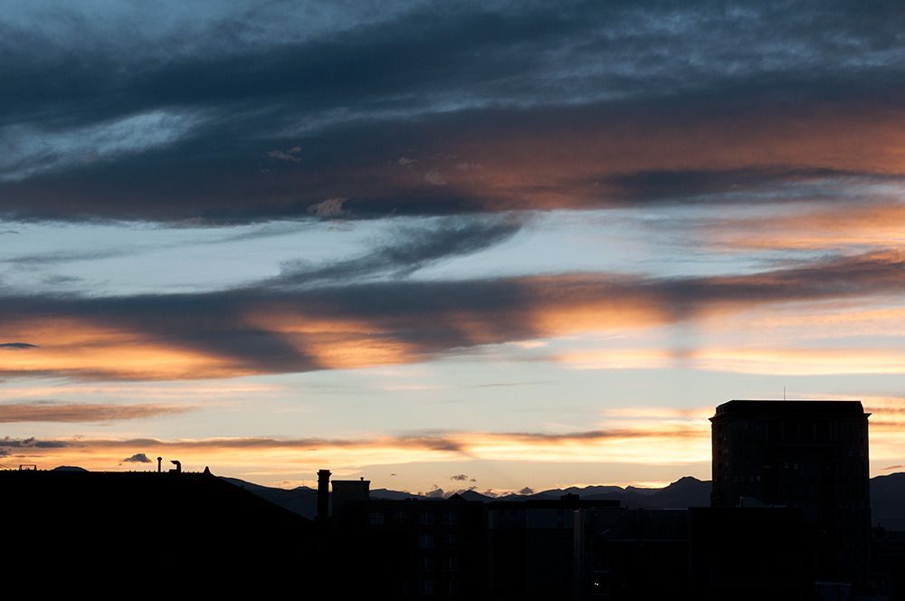 The cloud quilt is so vast continuing west straight over the foothills,  covering evenly the mountains behind them and still just that evenly covering the mountains behind those, that it actually follows the curve of the earth at least the portion of arc of our viewing, to the end of the state perhaps, maybe even through Utah. The sun never does slip under the clouds, can never illuminate from beneath them as usual so it stays concealed behind the cloud screen all the way down to darkness. Our down. The clouds could clear by the time the edge of night reaches California where the clouds may break and the sun shine through beneath as it as the earth rotates away from it.