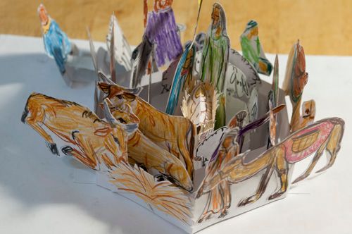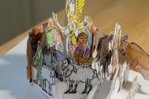 The manger is the same as the concentric bands except the two sides that attach are longer to form the shape of a manger. It will have a lid that is too big so that is bulges upward. Baby Jesus will be drawn on the lid. Hay will be placed between lid (with picture of baby) and sides of the manger.