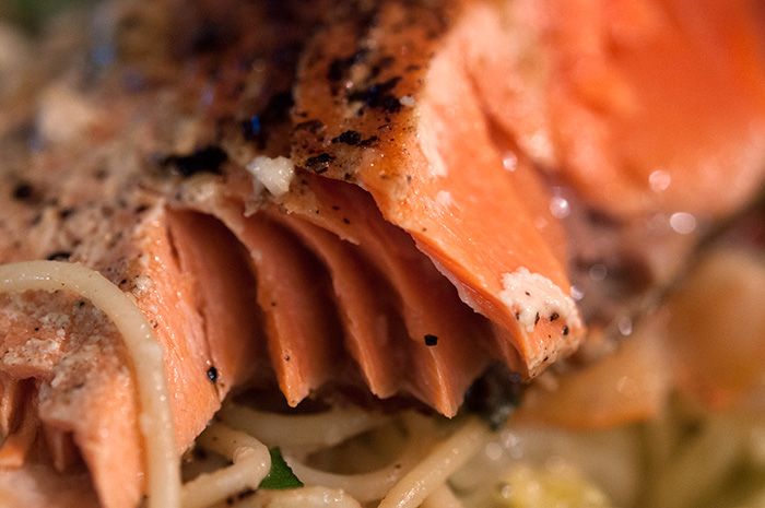 It has an incredibly shallow depth of field at close quarters, that is, a thin wall of focus. A wall of focus so thin the wall could be thin as paper. If a person's face you must decide if you want the eyes in focus or the tip of the nose, one or the other, but not both. All that out of focus, along with its glints, lends a sexy quality, even to food, like this: