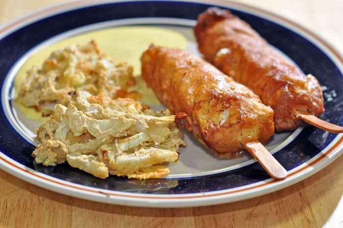 Tempura catfish, butternut squash, green beans, mushrooms, onions. I used beer in the batter.