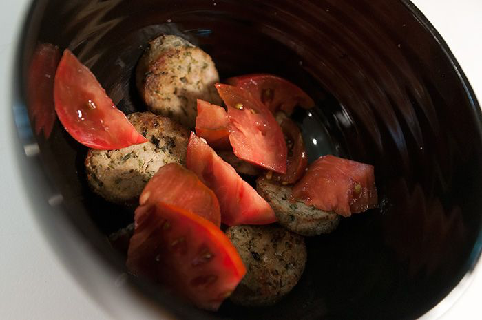 At the bottom of each bowl was one segment of fresh tomato and one slice of avocado. Just sitting there at the bottom of the bowl. You could see them at the bottom just waiting for you.